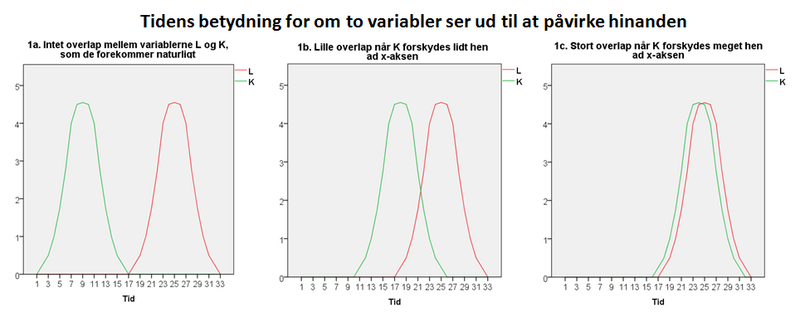 På figur 1a er vist hvordan variablerne L og K varierer over tid. Ændringer i L følges af præcis ligeså store ændringer i K, men med en tidslig forskydning på 16 enheder. For at statistiske analyser skal kunne vise hvor stærkt korrelerede tidsserierne er, er det nødvendigt at forskyde tidsserierne i forhold til hinanden. Krydskorrelationer vil kunne vise, at L og K korrelerer stærkest ved en forskydning på 16 enheder, samt at ændringer i K sker før ændringerne i L.